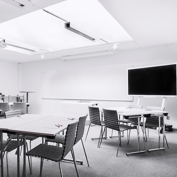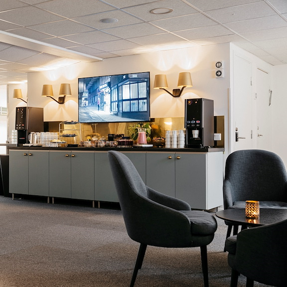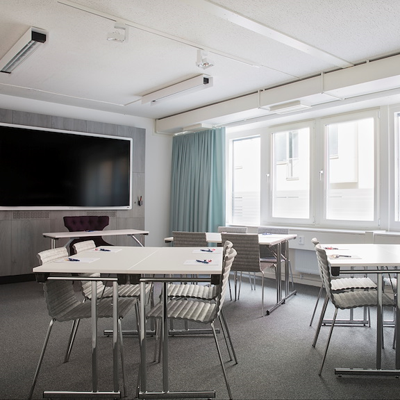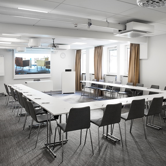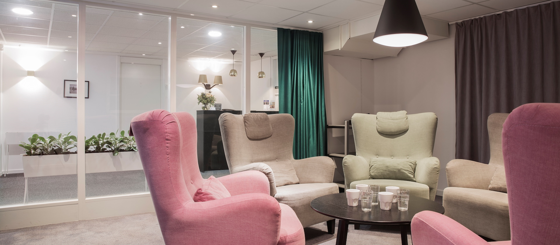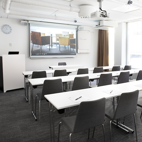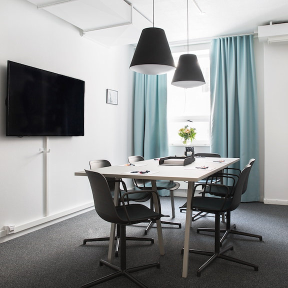 For the small and relaxed meeting, Skevik does the trick. In this cozy little meeting room, the atmosphere breaths unity. Large and relaxing armchairs, seated toward each other in a circle. We've taken special precautions to make the light as comfortable as possible since the only windows is toward the outside lounge – but fear not, there are curtains to block the view.